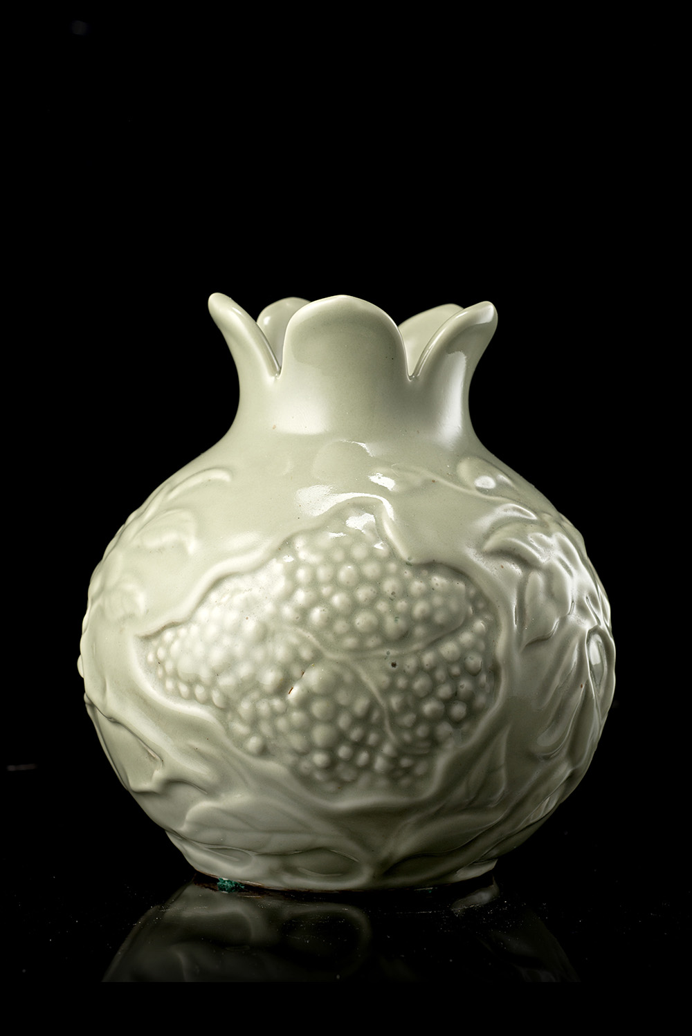Vasetto a forma di melograno in porcellana a invetriatura celadon, marchio...
