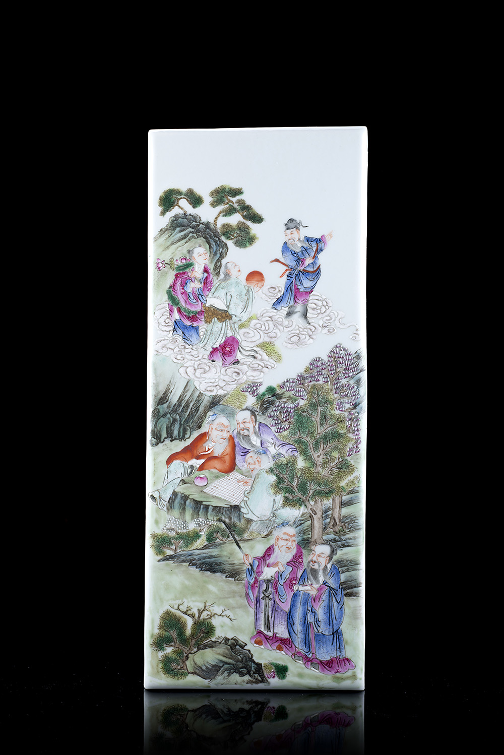Placca rettangolare in porcellana policroma decorata con Immortali taoisti tra nuvole bosco di pini
