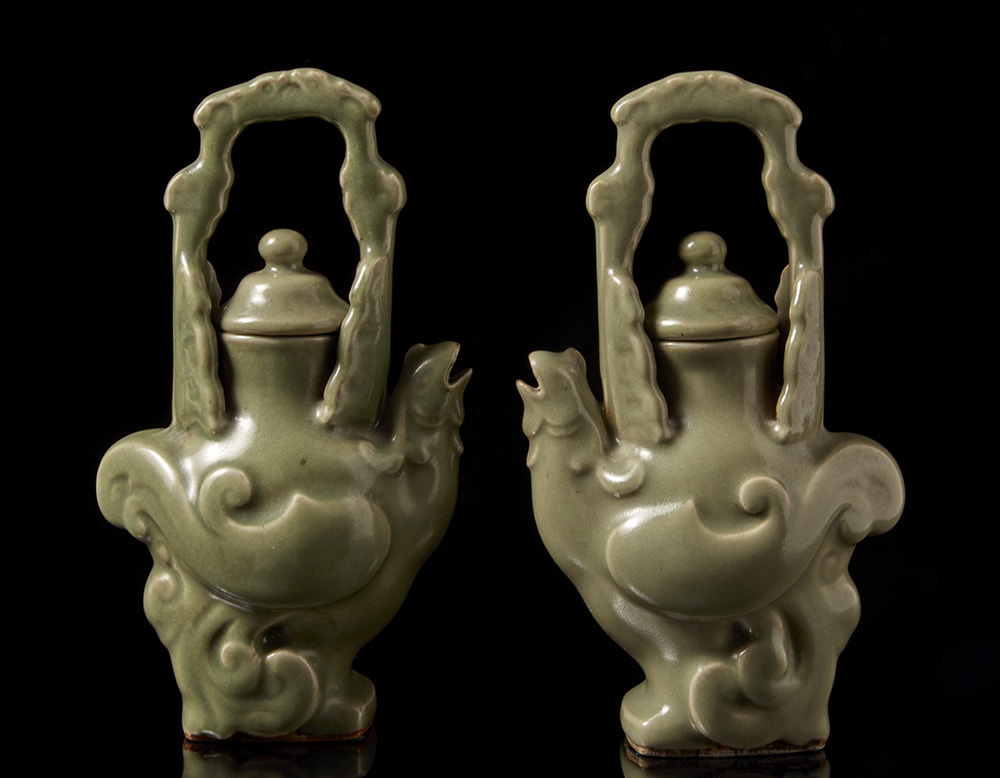 Coppia di versatoi con coperchio in porcellana celadon a guisa di creature fantastiche