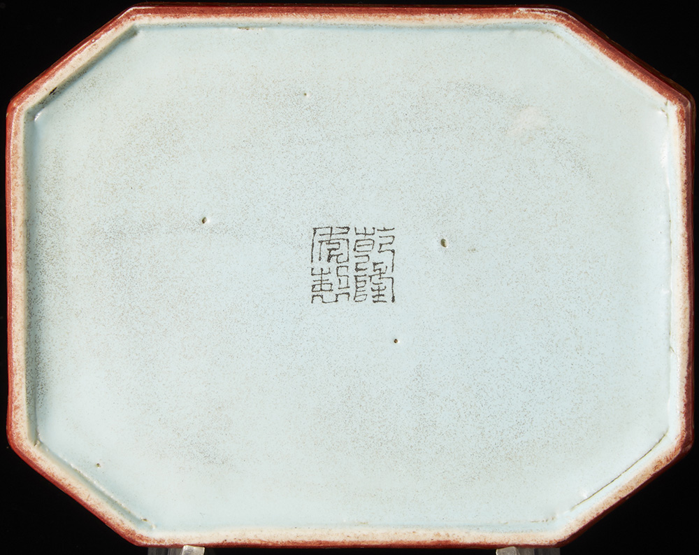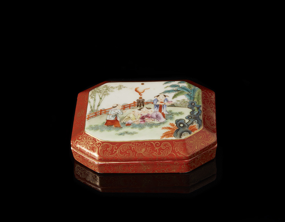 A small octagonal porcleain box decorated with a panel of boys against a coral and gilt ground, with apocryphal Qianlong mark to the base (slight defects)