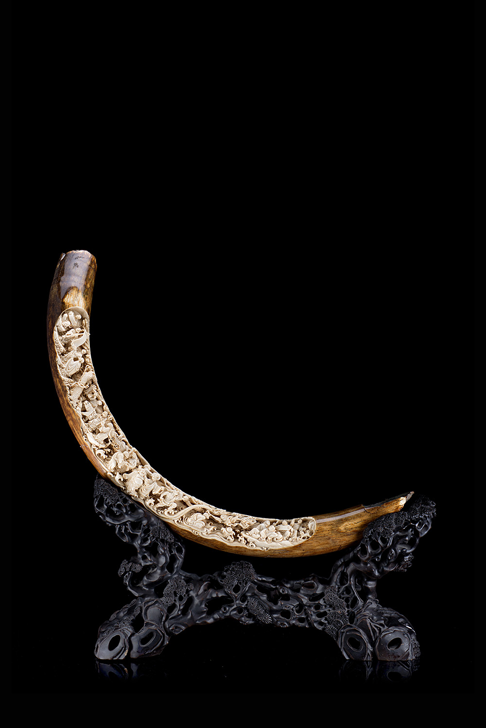 A section of an ivory tusk carved with Daoist Immortals, with wood base