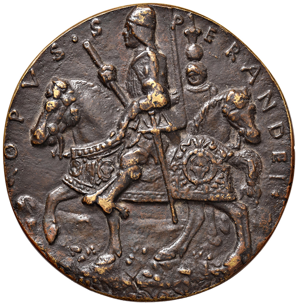 BOLOGNA. Giovanni Bentivoglio (1443-1509). Signore di Bologna dal 1462 al 1506. Medaglia in bronzo mm 91. D/ Busto a d., con berretto e corazza. R/ Giovanni Bentivoglio a cavallo al passo a s. Opus Sperandio. Johnson-Martini 466 (mm. 91)Bel BB.