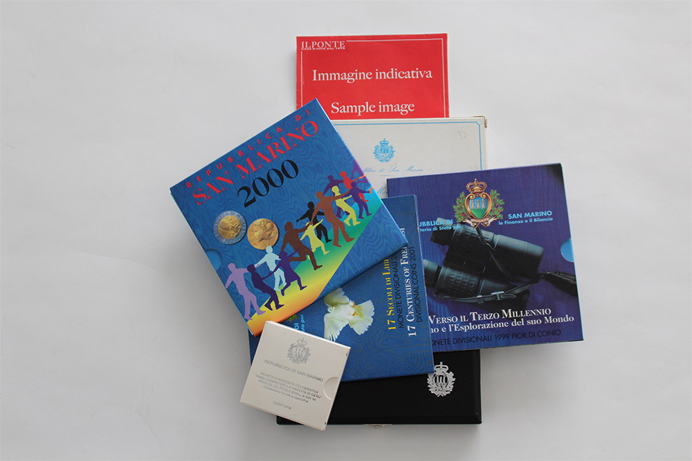 SAN MARINO. Lotto di varie decine di serie e monete commemorative in confezione di zecca, anche Fondo Specchio. Fa parte del lotto una moneta italiana commemorativa da 500 lire in argento.