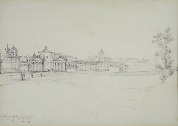 Entrata del giardino Borghese da Porta del Popolo e Il ponte di Rialto a Venezia, 1829 Matita su carta iscrizioni in basso a sinistra, datati: "primo dic. 1829" e "17 maggio 1829", cornici in legno dorato.