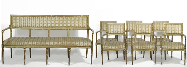 Salotto in legno laccato e dorato composto da sei poltrone e un divano schienali lineari, braccioli sagomati e scanalati, montanti e gambe anteriori a colonnine rudenate, gambe posteriori troncopiramidali, Toscana ultimo quarto XVIII sec. Imbottite in tessuto a fiori. cm. 93x170x57