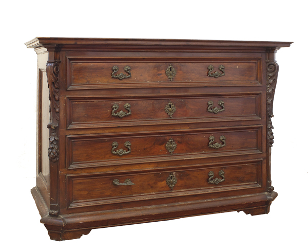 Cassettone in noce, quattro cassetti sformellati e lesene scolpite, piedi a mensola , Italia Centrale, XVII sec., cm. 11x156x67