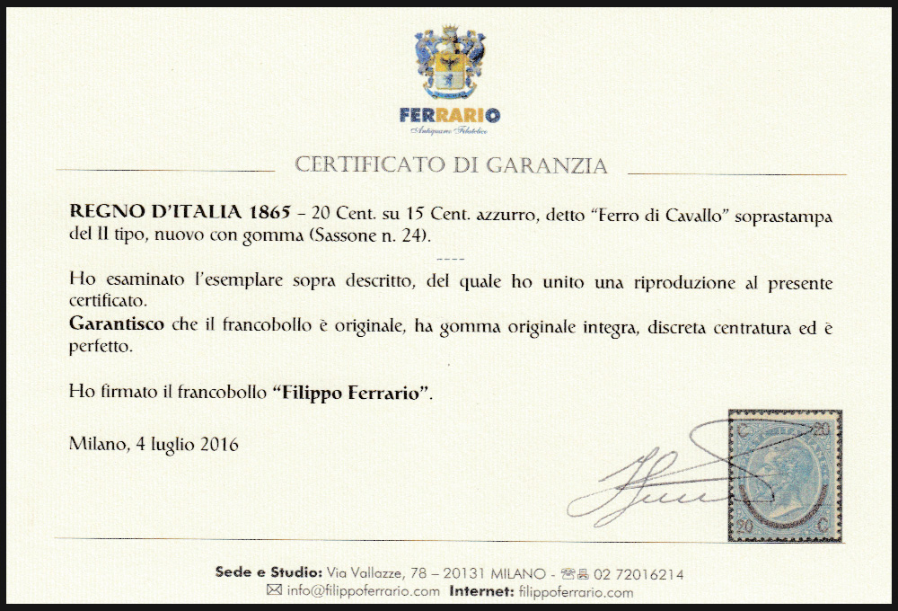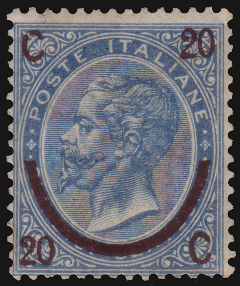 REGNO D'ITALIA 1865"Ferro di cavallo". 20/15c. azzurro, II tipo. Da...