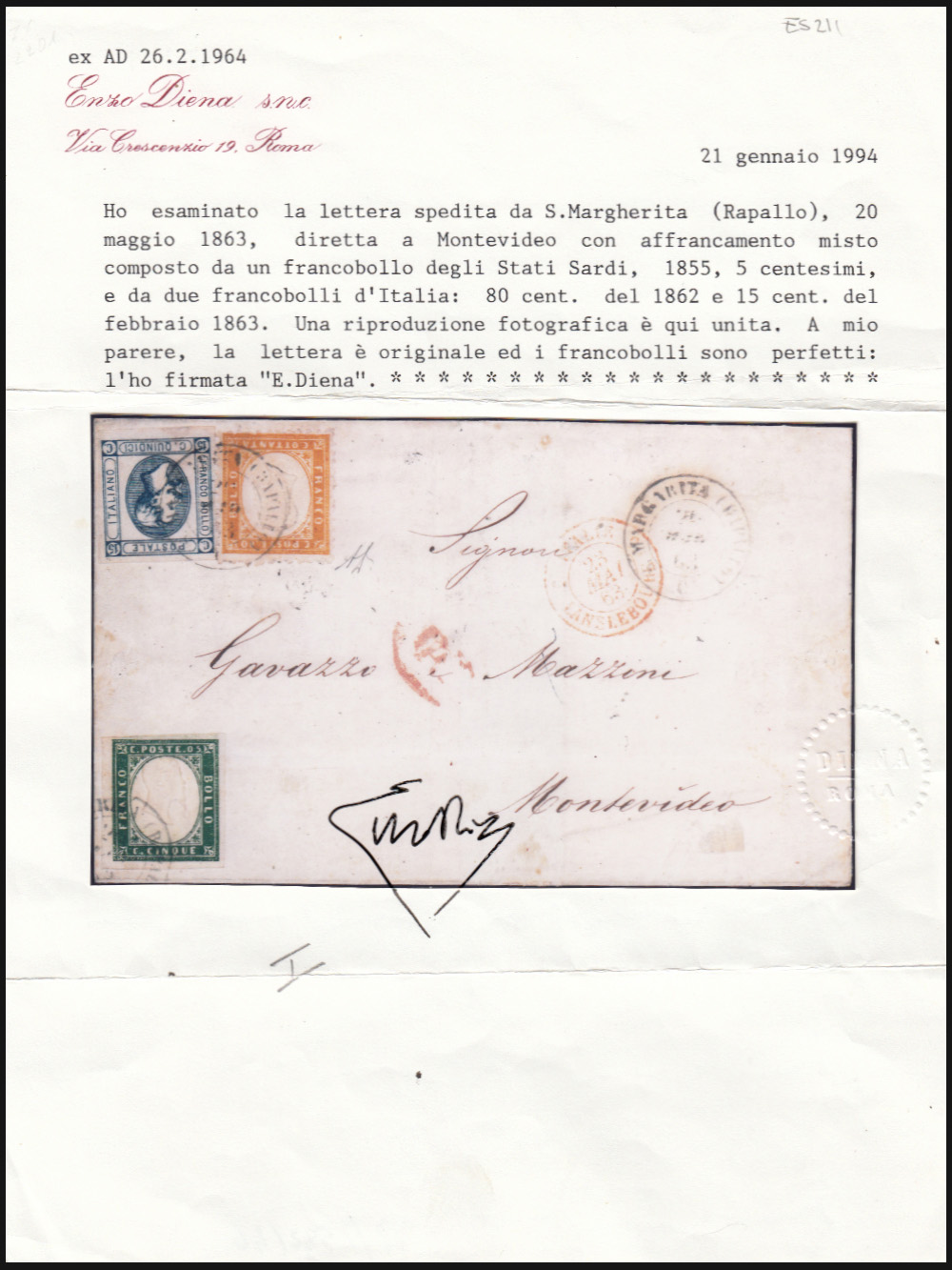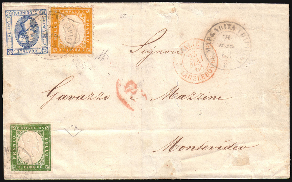 Lettera senza testo da S. Margherita per Montevideo (Uruguay), affrancata per 1 lira con Sardegna 5c. verde, 80c. giallo arancio tipo Sardegna dentellato e 15c. litografico I tipo. Leggera piega orizzontale che attraversa l'esemplare da 5c.