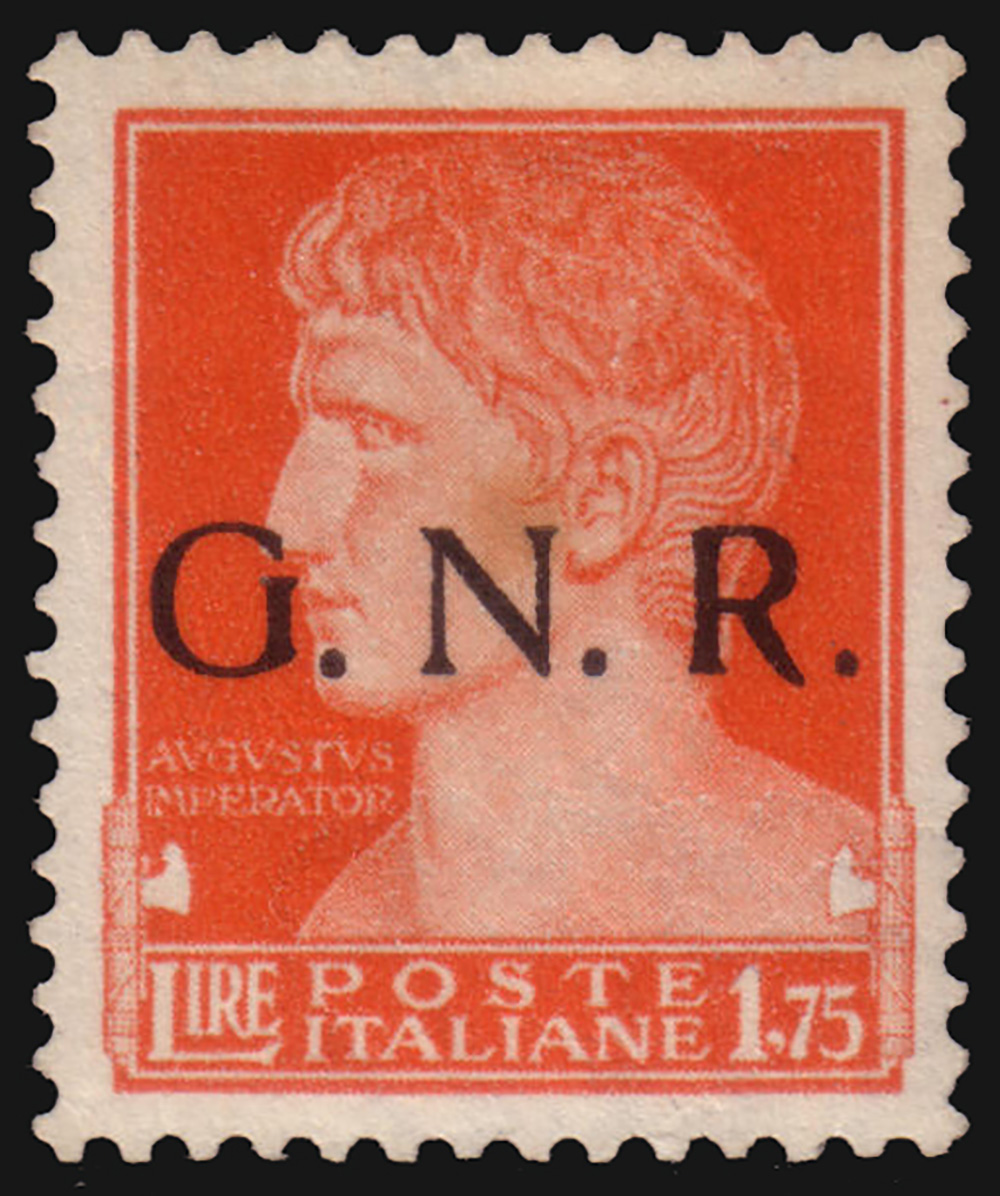 1,75 lire arancio soprastampa "G.N.R." di Brescia del I tipo. Leggero imbrunimento dovuto alla colla sopra la "N" di "G.N.R."