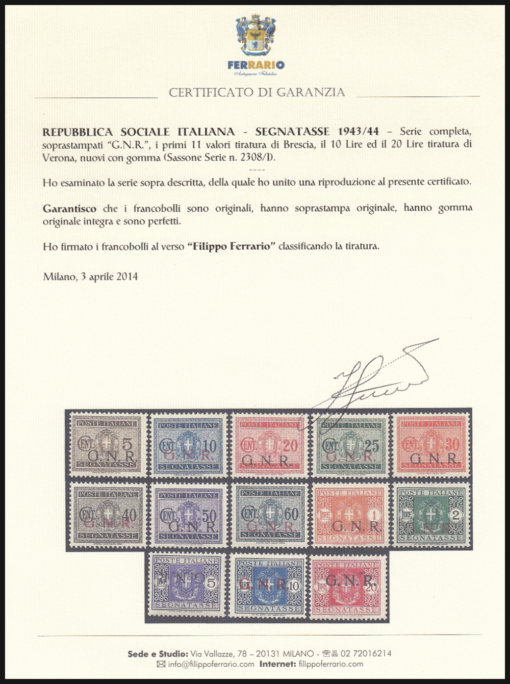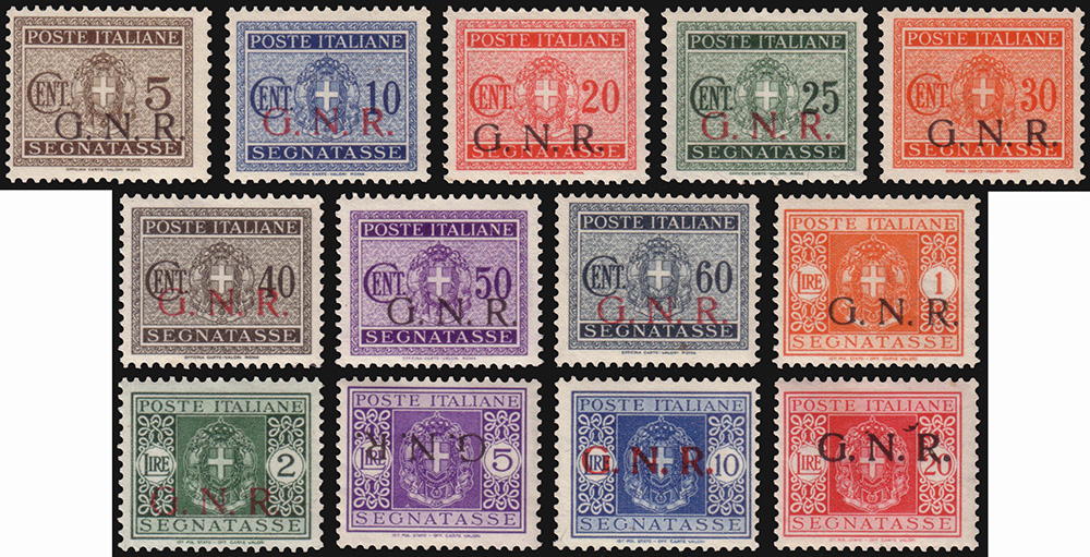 Segnatasse. Serie completa soprastampata "G.N.R.". Dal 5c. al 5 lire tiratura di Brescia, 10 e 20 lire tiratura di Verona