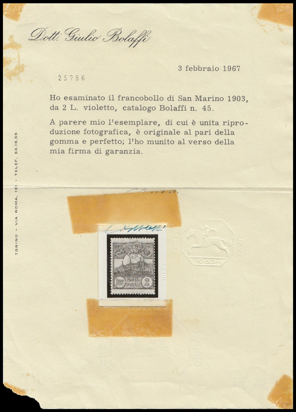 Lot 267 | SAN MARINO 1903"Cifra o veduta". Serie completa di 12 valoriCert. G. Bolaffi....