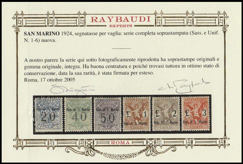 Lot 269 | SAN MARINO 1924Segnatasse per vaglia. Serie completa di 6 valoriCert. M....