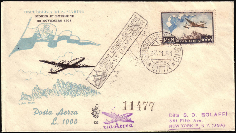 SAN MARINO 1951 (22 nov.)Posta aerea. Busta primo giorno edizioni "Venetia",...