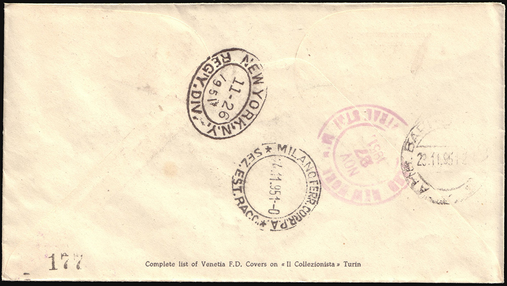 Posta aerea. Busta primo giorno edizioni "Venetia", affrancata con 1000 lire "Bandiera", spedita per raccomandata da "Città" per New York (USA). Timbri di arrivo al verso