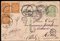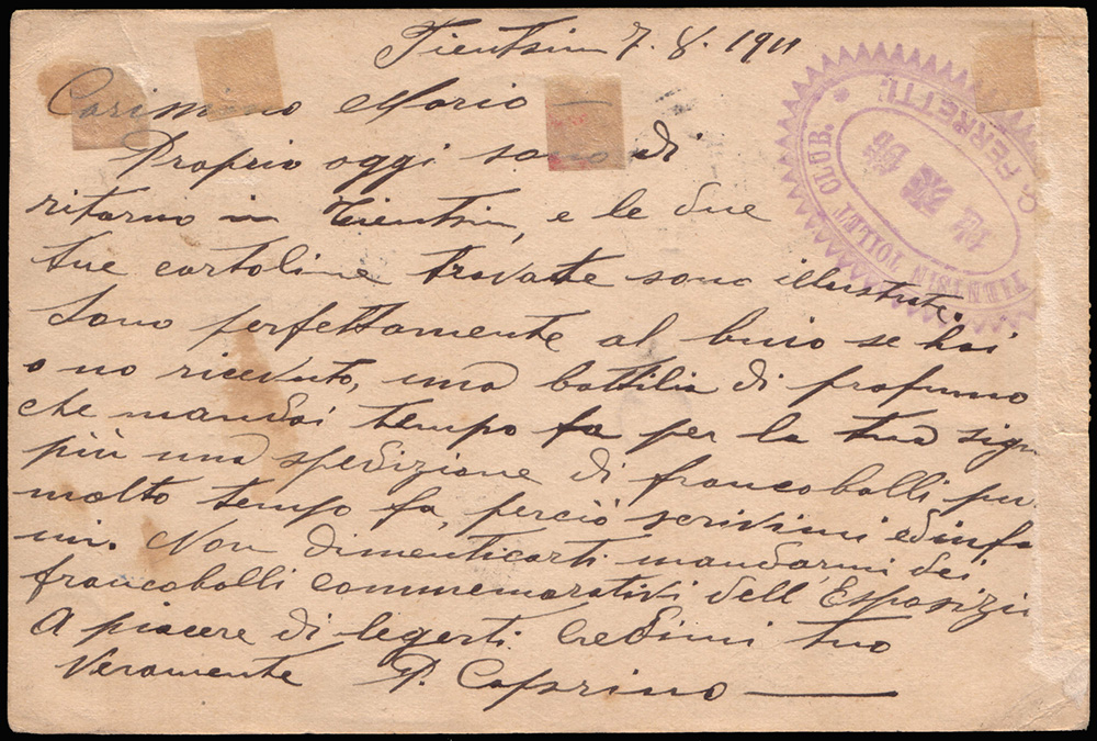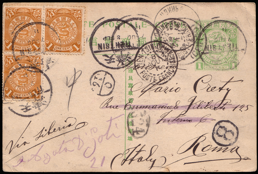 Postcard of 1c. Green plus 3 stamps from 1c. brown orange "Chinese Imperial Post", shipped from Tianjin, via Siberia, Rome. Interesting cancel the foreign offices of France and Russia.