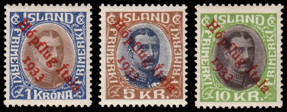 Posta aerea "Crociera del Decennale". Serie completa di 3 valori soprastampati "Hópflug Ítala/1933"