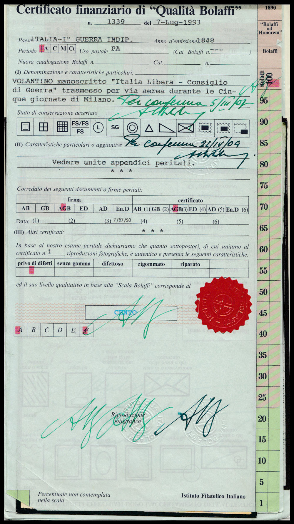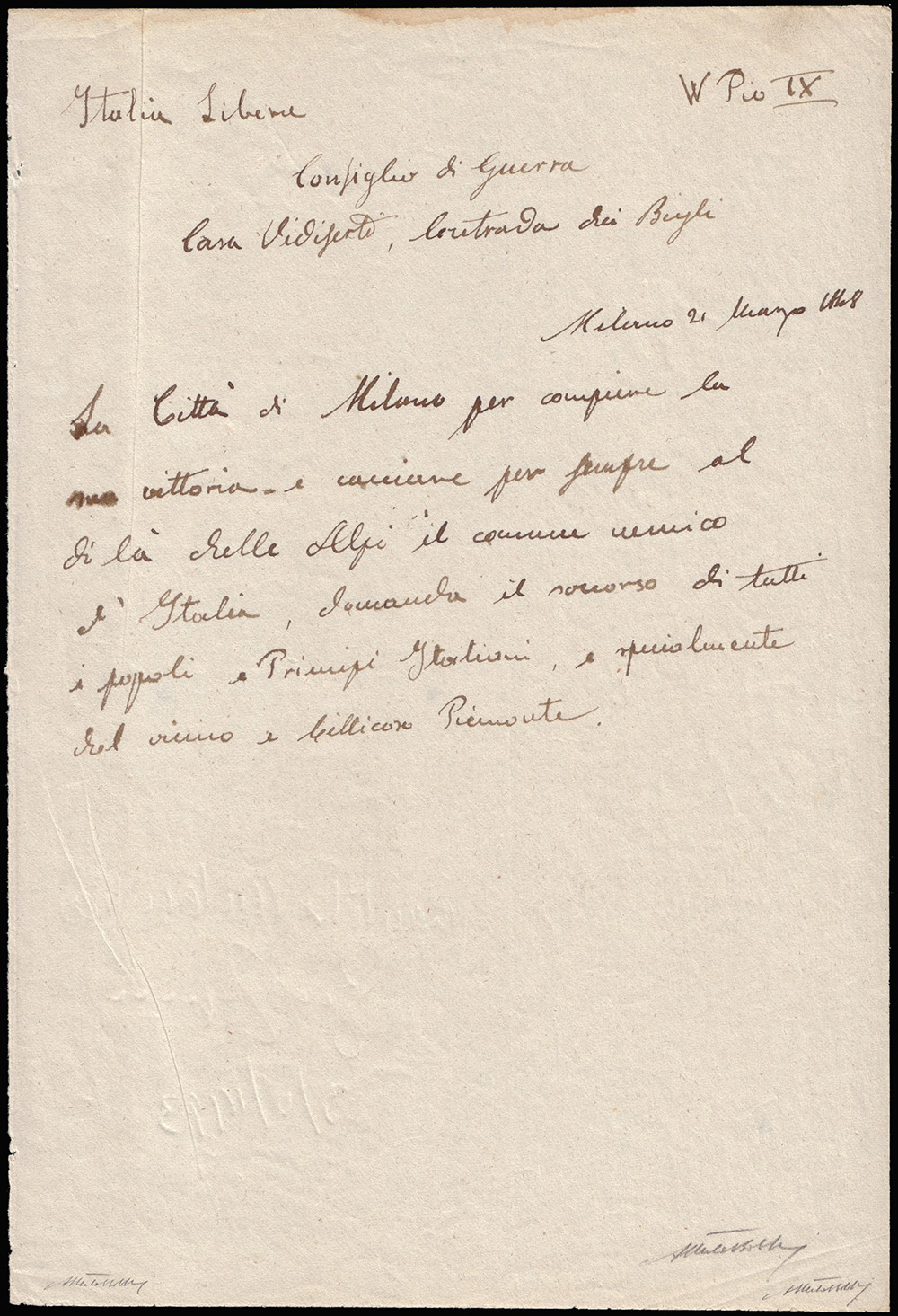 Volantino "Italia Libera / W Pio IX / Consiglio di Guerra" lanciato, tramite piccolo pallone aerostatico di carta, durante le "Cinque Giornate di Milano", dall'interno della città verso la campagna.