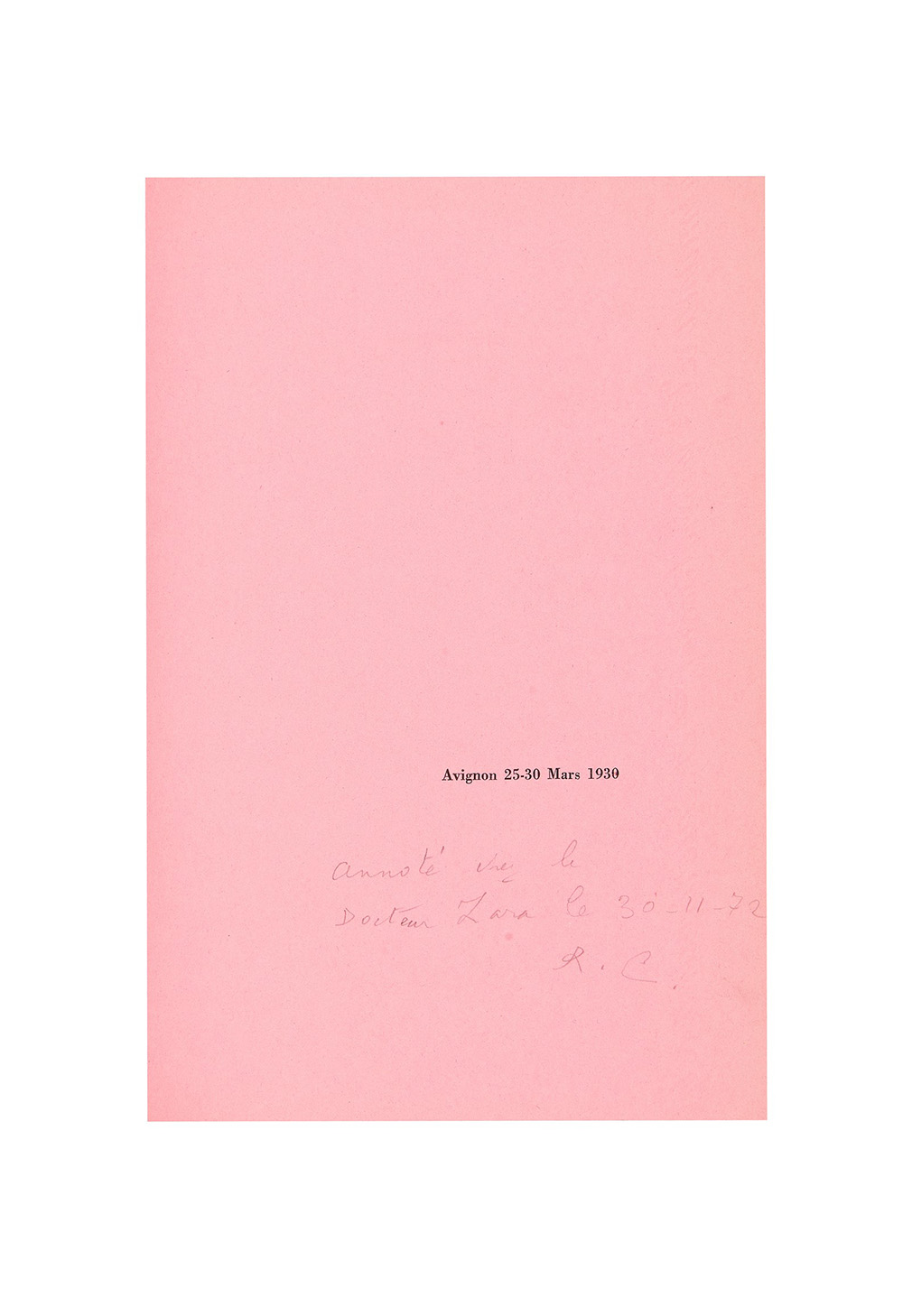 8vo (277 x 184mm). On pink paper. Finely bound by De Vauchelle preserving original wrappers, in matching slipcase. Provenance: René Char (inscription and annotations).