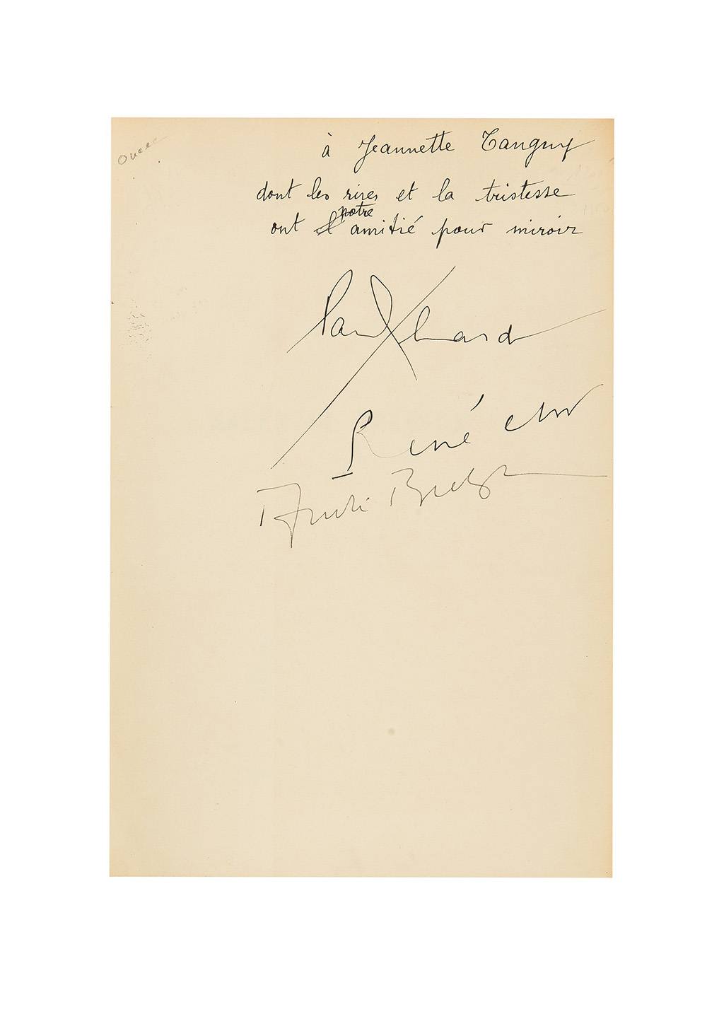 Rara prima edizione, copia di presentazione dedicata dai tre artisti a Jeannette Ducrocq Tanguy "dont les rives et la tristesse on notre amitié pour miroir Paul Eluard, René Char, André Breton". Durante il periodo in cui Yves Tanguy fu sposato con la sua prima moglie Jeannette, Breton gli diede uno stipendio e un contratto per dipingergli 12 quadri l'anno. Esemplare n. 245 di 300 copie su carta Lafuma-Navarre.