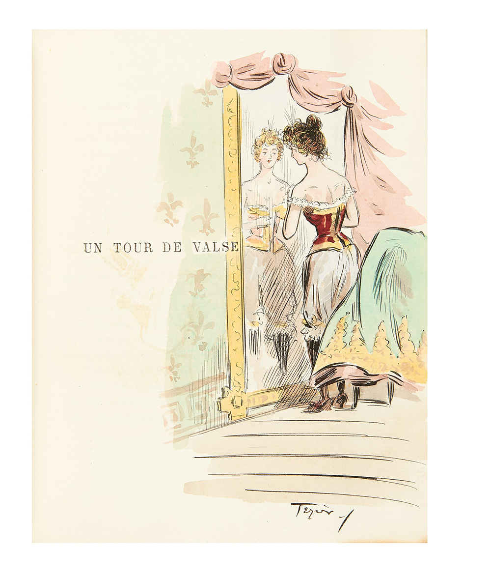 12mo (190 x ca. 160mm). Seven short novels (on laid paper with irregular size) illustrated by 6 watercolours and 6 china drawings by Eugène Terier (?), one dated "'96" (light browning on the margins). Half-calf binding with marbled panels realized by P.[etrus] Ruban 1904 (stamp on the first flyleaf) preserving the original orange wrappers printed in black, in cardboard box (lightly rubbed). Provenance: manuscript letter by Eugène Terier decorated by a nice china drawing and addressed to a friend.