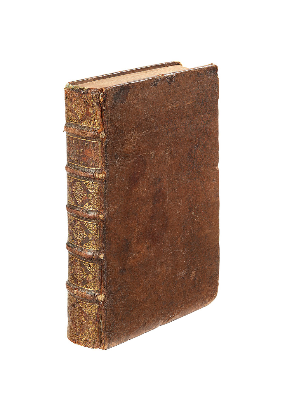4to (250 x 175mm). Printer device on title, woodcut initials, frames and endpieces, in particular printed device (e1), vignette and engraved figurative initial (e2) in modern colours, collation a4, e4, A-5B4, A-K4, with the last 4K4 verso blank (spotting, browning mainly in the last section, waterstaining). Contemporary calf with gilt spine, red sprinkled edges (rubbed, some wear to spine, staining). Provenance: ownership annotation on title "Je suis aux hospitalieres Fauxboux St. Marcel chifre huit de la Bibliotheque", repeated similarly on front endpaper (XVIII century).