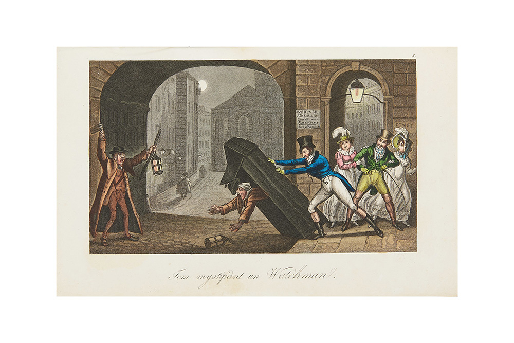8vo (224 x 140mm). 24 incisioni acquerellate a mano all'epoca e 5 vignette xilografiche alla fine di alcune sezioni ad opera dei caricaturisti George et Robert Cruikshank (alcune fioriture e lievi bruniture). Pieno vitello marrone coevo, con ricche decorazioni in oro e punzonature articolate, tagli dorati, titolo e anno al dorso (lievi graffi). Provenienza: Beguin (etichetta).