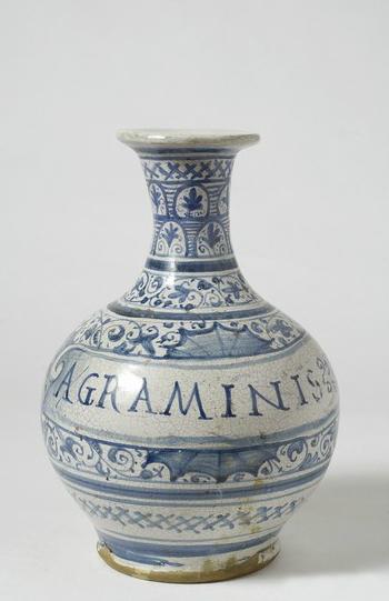 Fiasca in maiolica decorata a motivi ornamentali e iscrizione al centro, Italia centrale XVII sec. (restauri)