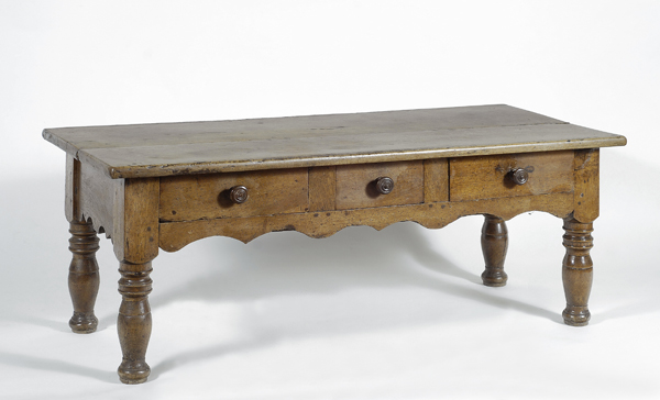 Tavolino in noce, piano rettangolare, tre sportelli sotto la fascia smerlata,...