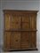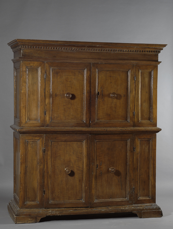 a due corpi, due sportelli nella parte inferiore con tre cassetti interni e due mensole, due sportelli sulla parte superiore, cappello con cornice aggettante, base modanata su piedi a mensola, Emilia, XVII sec., cm. 187x162x64,5
