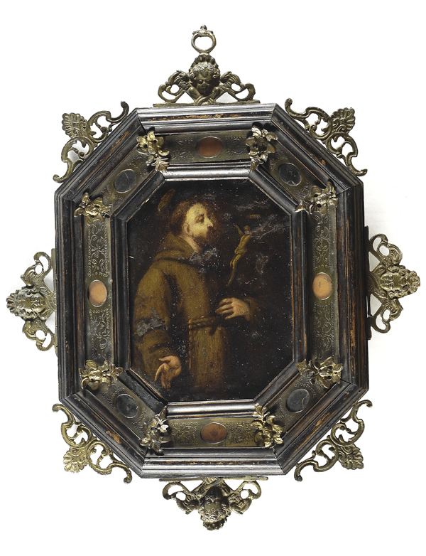 Scuola Toscana, XVI sec. San Francesco Olio su rame, cm. 17x13 cornice ottagonale in legno dipinto con inserti in metallo inciso e sbalzato e pietre dure (inizi XIX sec.).