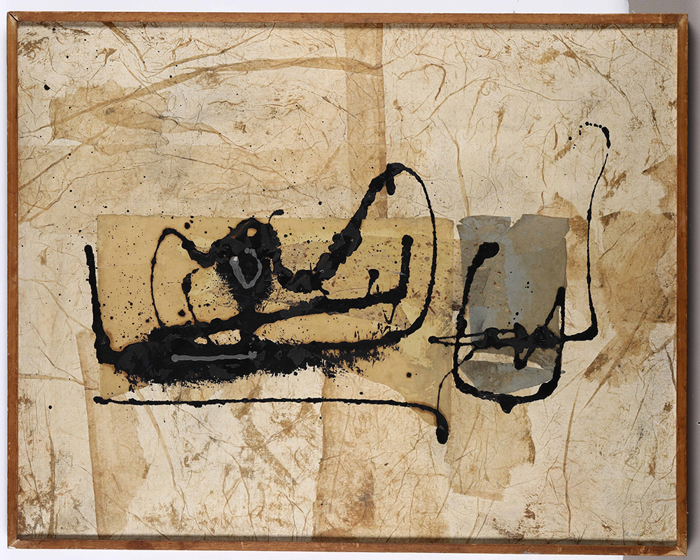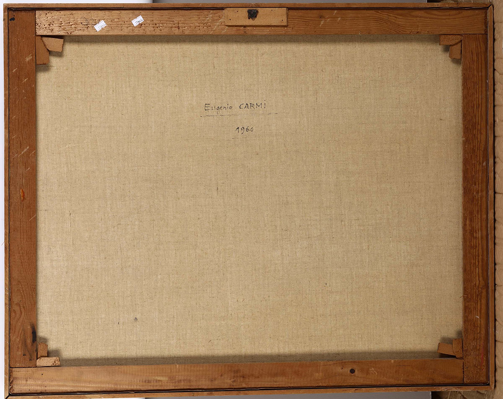 Eugenio Carmi (1920-2016) Senza titolo, 1960 collage e tecnica mista su tela, cm 72x91 firmato in basso a destra firmato e datato al retro l'opera presenta una patina di sporco e ondulazione della tela in corrispondenza dell’angolo superiore a sinistra Eugenio Carmi (1920-2016), Untitled, 1960 collage and mixed media on canvas, cm 72x91 signed lower right signed and dated on the back