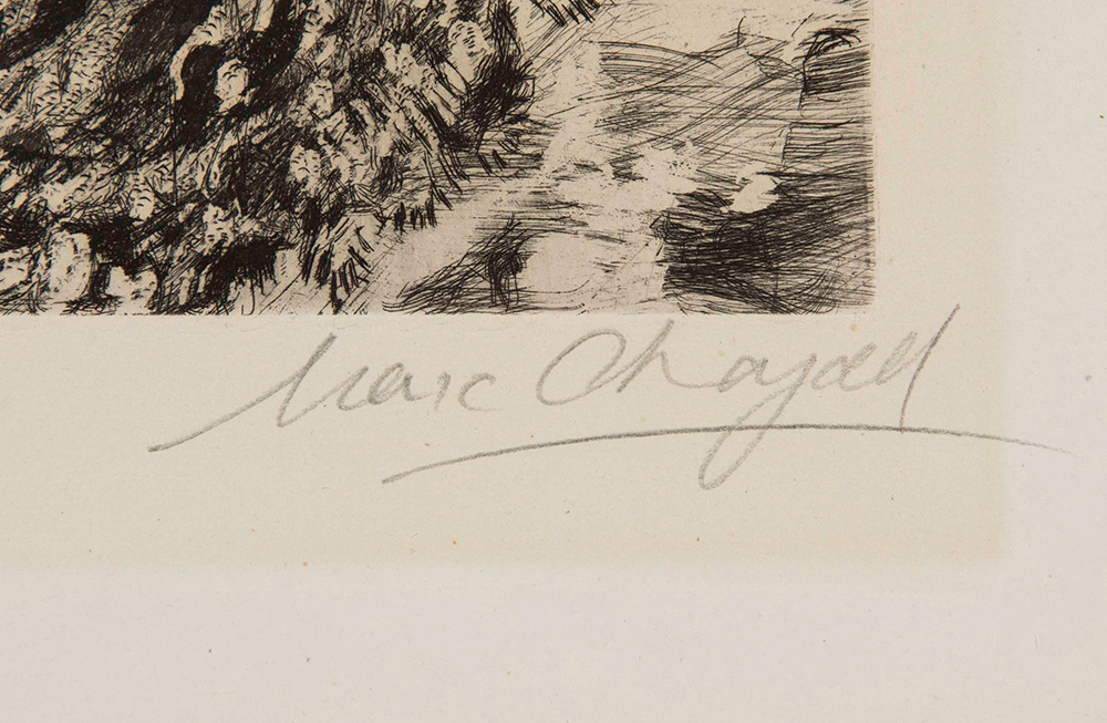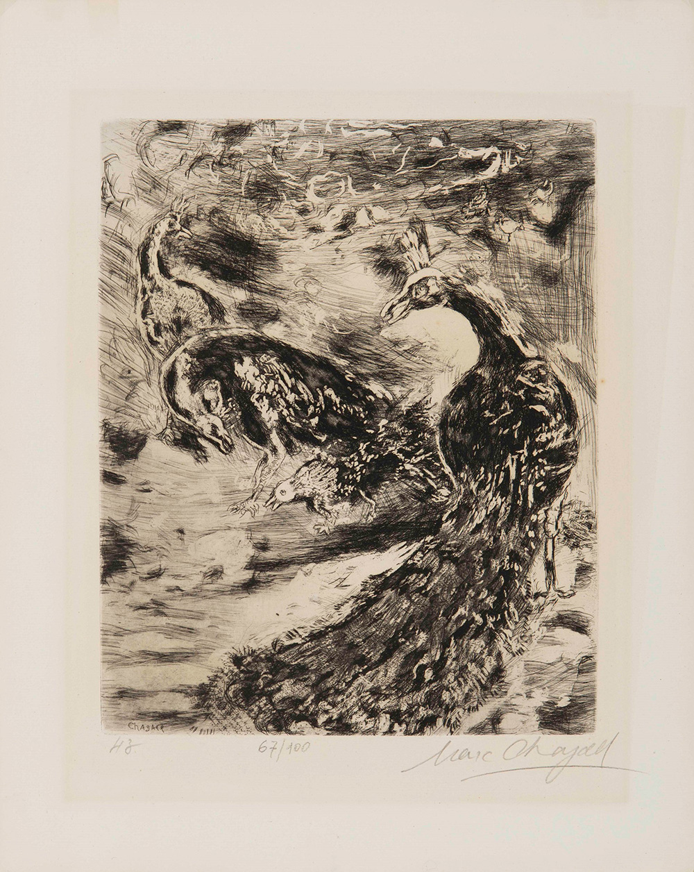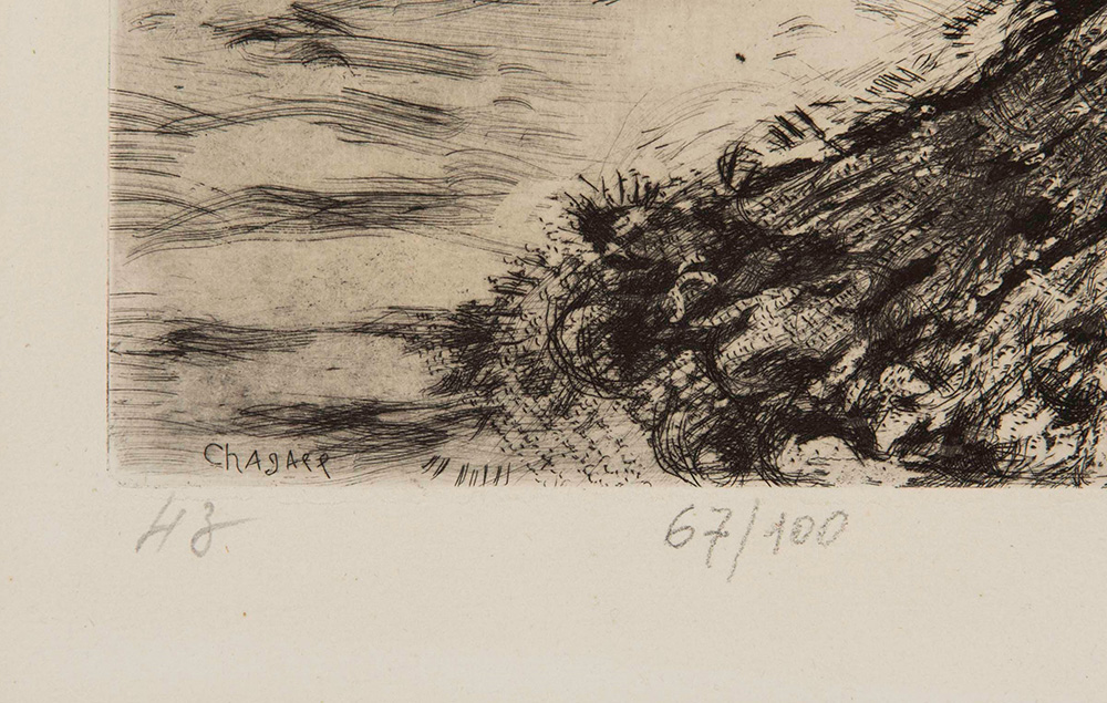 Marc Chagall (1887-1985) Incisione per La Fontaine, 1948 incisione su carta, cm 42x33,5 firmata in basso a destra, datata in basso a sinistra es. 67/100 Marc Chagall (1887-1985), Incisione per La Fontaine, 1948 incision on paper, cm 42x33,5 signed lower right, dated lower left es. 67/100