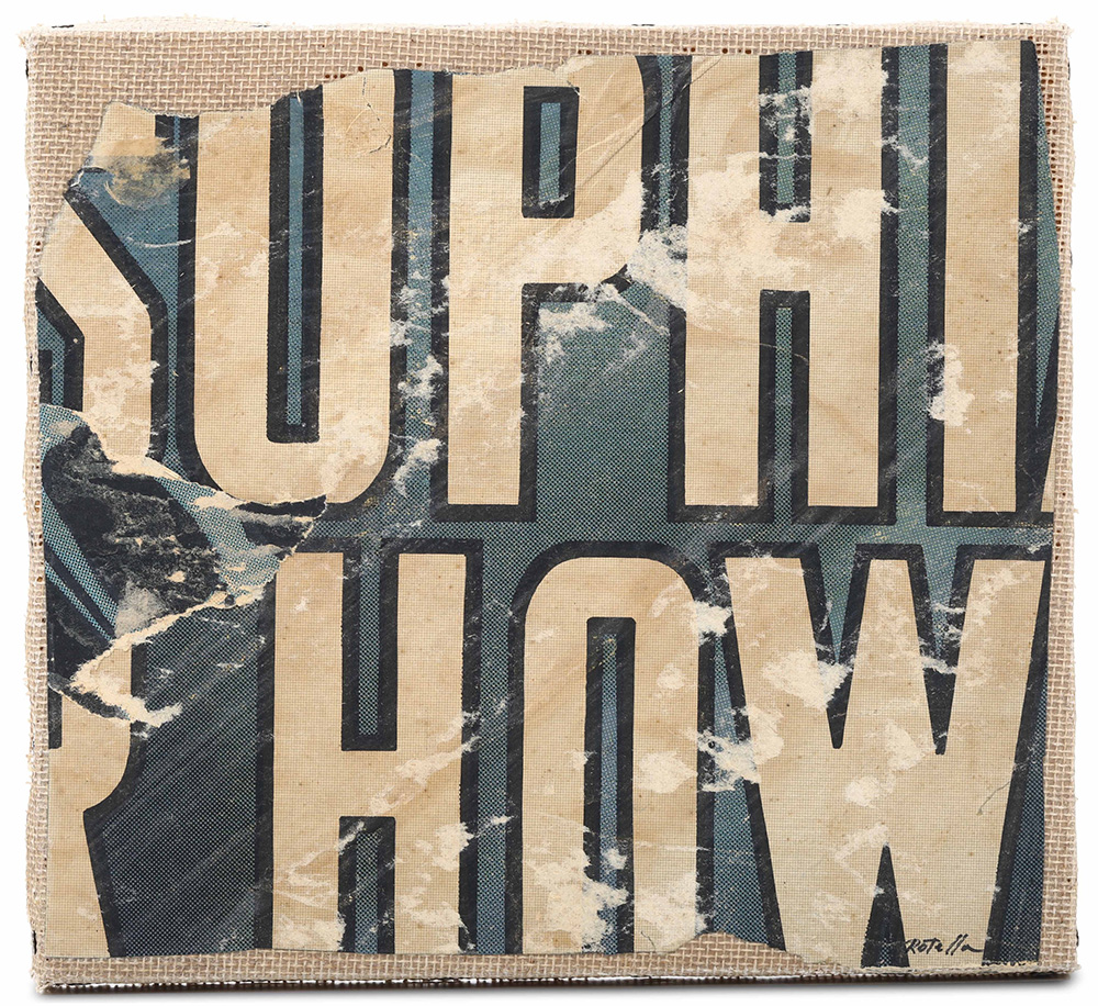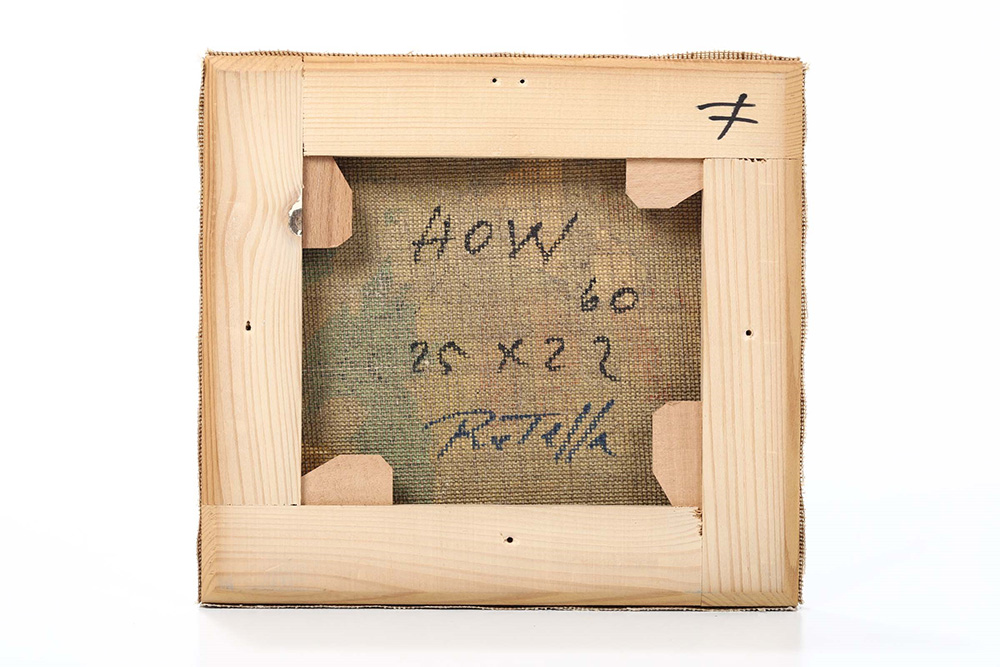 Mimmo Rotella (1918-2006) How, 1960 tecnica mista su tela, cm 21x23 firmato, datato e intitolato al retro Opera registrata presso la Fondazione Mimmo Rotella, Milano, con il codice di Archivio 2114 DC 960/960 Mimmo Rotella (1918-2006), How, 1960 Mixed technique on canvas, Cm 21 x 23 Work registered at Fondazione Mimmo Rotella