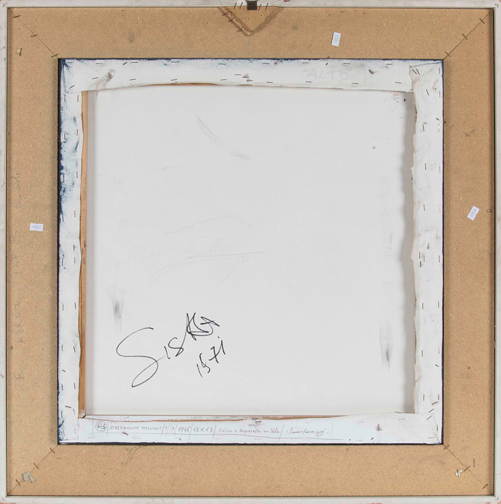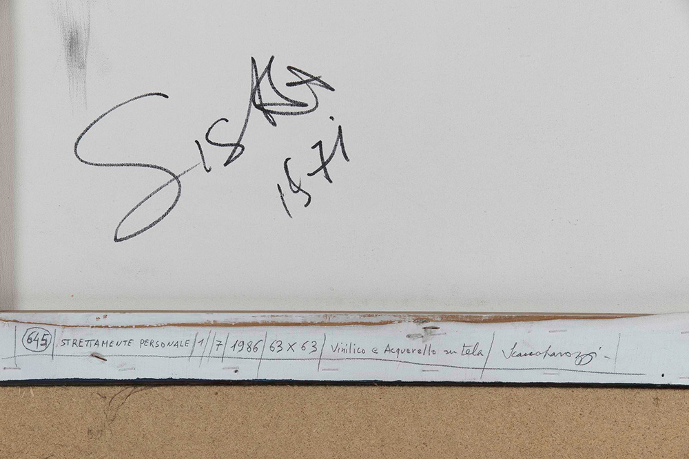 Antonio Scaccabarozzi (1936) Strettamente personale, 1986 vinilico e acquarello su tela, cm 63x63 firmato, intitolato e datato al retro Opera registrata presso l’Archivio Antonio Scaccabarozzi, con il n. 18/10 e verrà inclusa nel Catalogo Ragionato a cura dell’Archivio, attualmente in preparazione l'opera presenta una deformazione della tela nella parte superiore verso destra di cm 30, facilmente restaurabile Antonio Scaccabarozzi (1936), Strettamente personale 1986 watercolour on canvas Cm 63 x 63 Signature on the back Work registered at Archivio Antonio Scaccabarrozzi