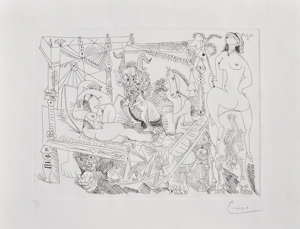 Pablo Picasso (Malaga 1881 - Mougins 1973) Senza titolo (dalla serie 347 scene erotiche), 1968;Acquaforte, 28,5 x 38,5 (lastra), 45,5 x 54,5 (foglio), dalla serie Erotica