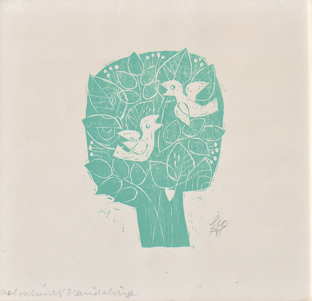 Heiner Gschwendt Zwei Vögel im Baum, 1974;Holzschnitt, 24 x 25,3 cm, gerahmt