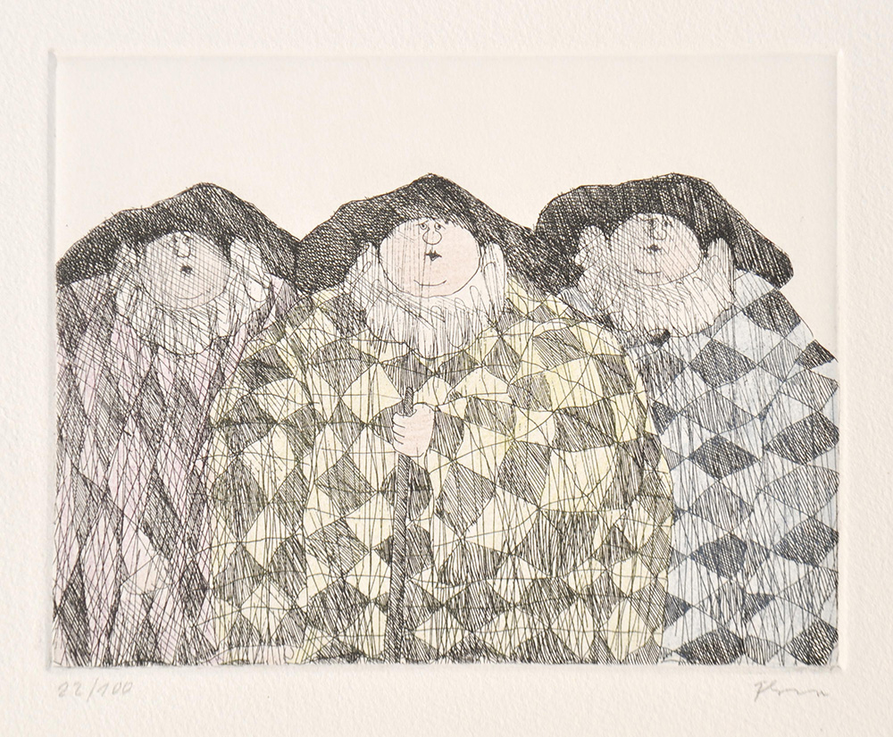 Paul Flora Drei Bajazzi;Handkolorierte Radierung, 11,5 x 14,5 cm (Platte),