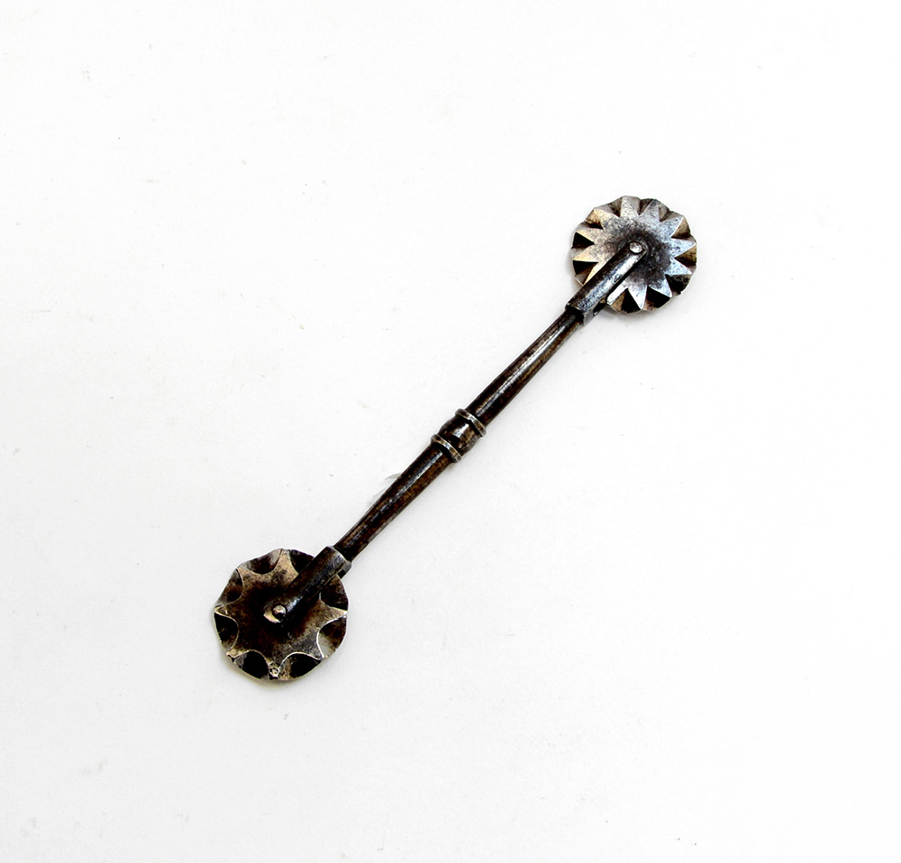 An iron double wheel pastry jigger (Landini p. 120; Finlay p 24)