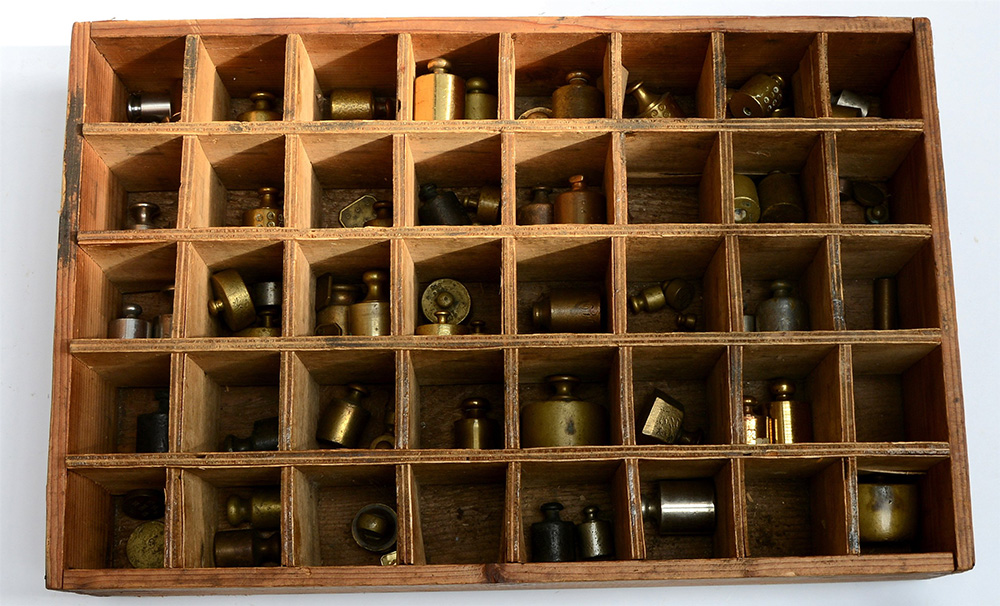Collezione di piccoli pesi in ottone in espositore di legno-ENA lot of...