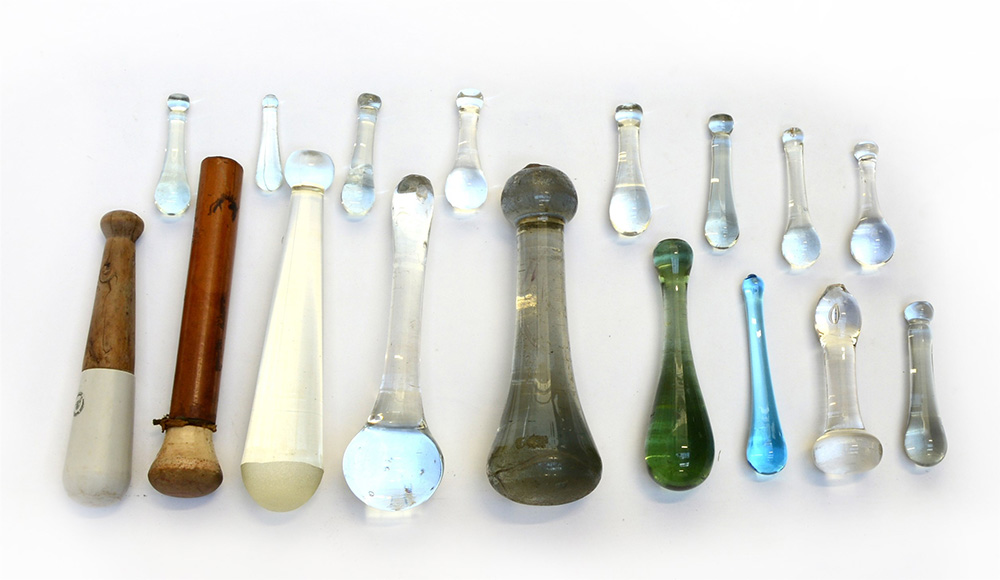 Fifteen glass pestles and two wooden/ceramic pestles. (minor defects)
