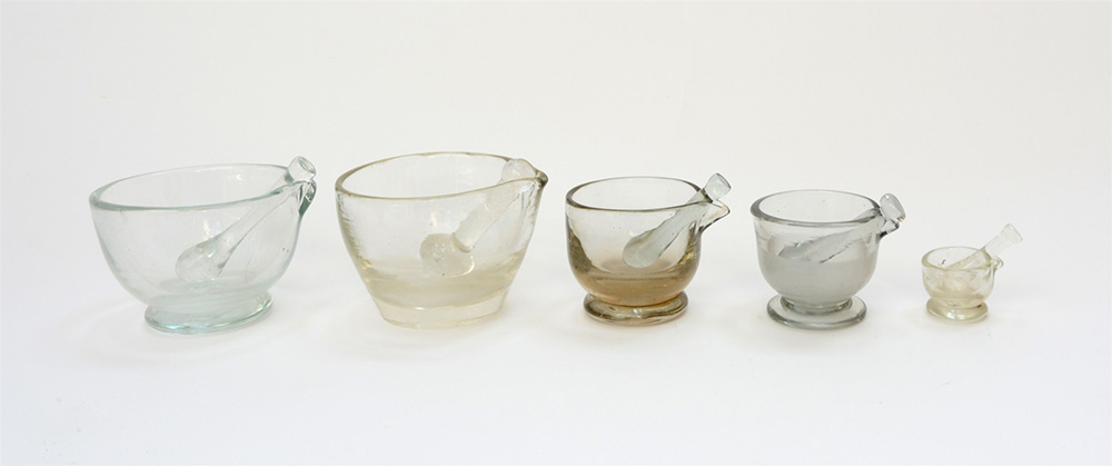 Scatola contenente un lotto di cinque mortai con pestelli in vetro,...