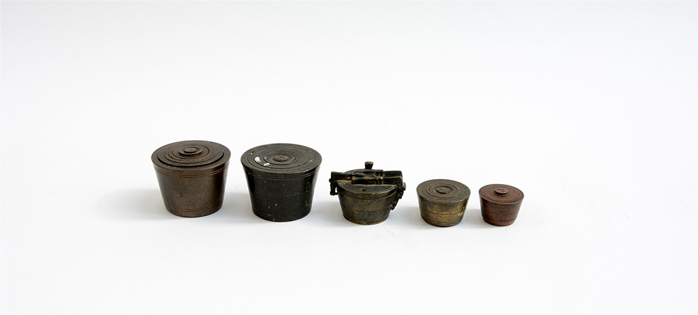 Lotto composto da cinque pesi a pila in ottone e bronzo (difetti)