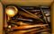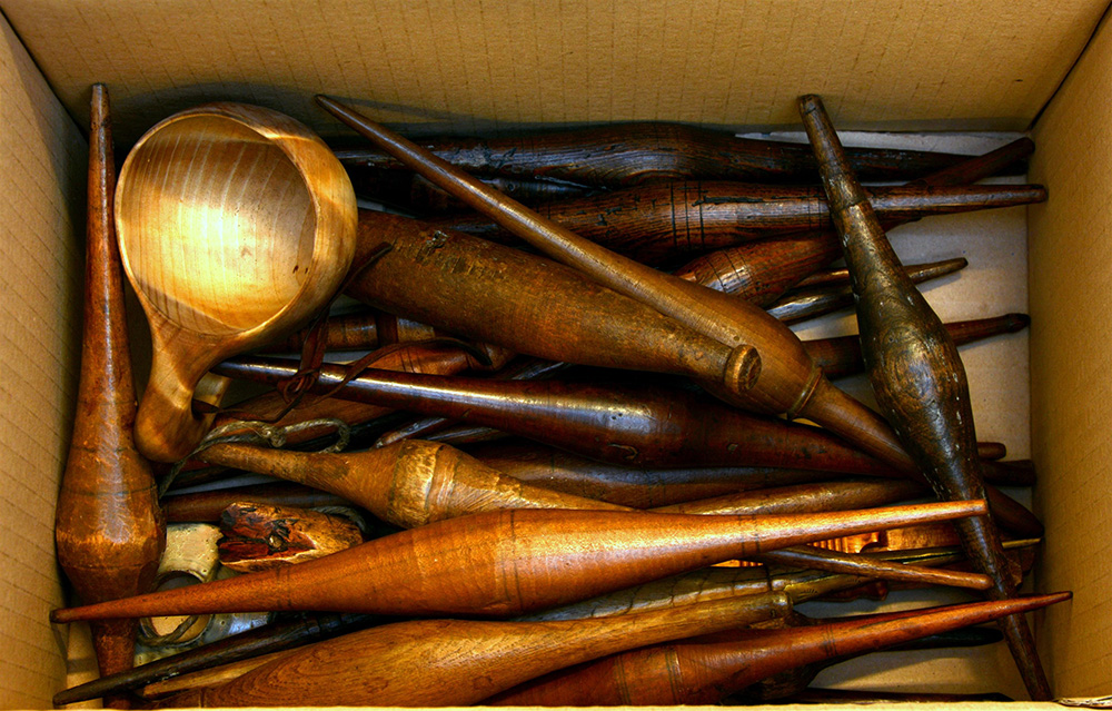 Lotto composto da vari strumenti in legno per la filatura e il cucito