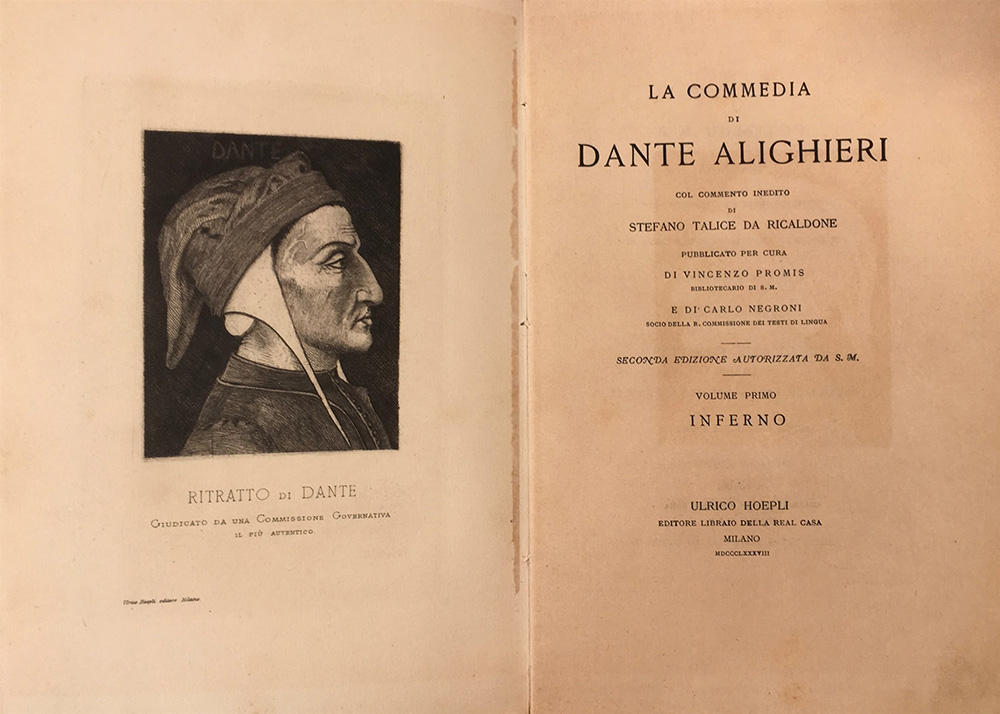 La Commedia di Dante Alighieri col commento di Stefano Talice da Ricaldone. Milano: Ulrico Hoepli, 1888. 3 voll. con ritratto di Dante in antiporta (I vol.) (fioriture, macchie). Brossura editoriale color crema stampata in nero e rosso, entro cofanetto (brossura usurata, difetti).