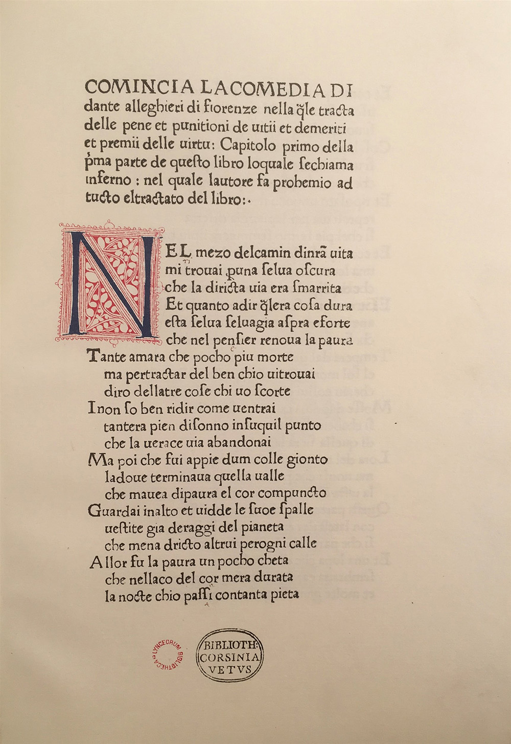 DANTE ALIGHIERI - La Comedia. Roma: Stabilimento tipografico Julia, 1965. Esemplare Corsiniano della prima edizione della Divina Commedia stampata a Foglino l'11 aprile 1472 da Johann Numeister ed Evangelista Angelii da Trevi, con note di A. Casamassima e A. Petrucci. Esemplare n. 392 da una edizione complessiva di 1000. Legatura in piena pelle blu con decori in oro, entro cofanetto editoriale (lievi difetti).