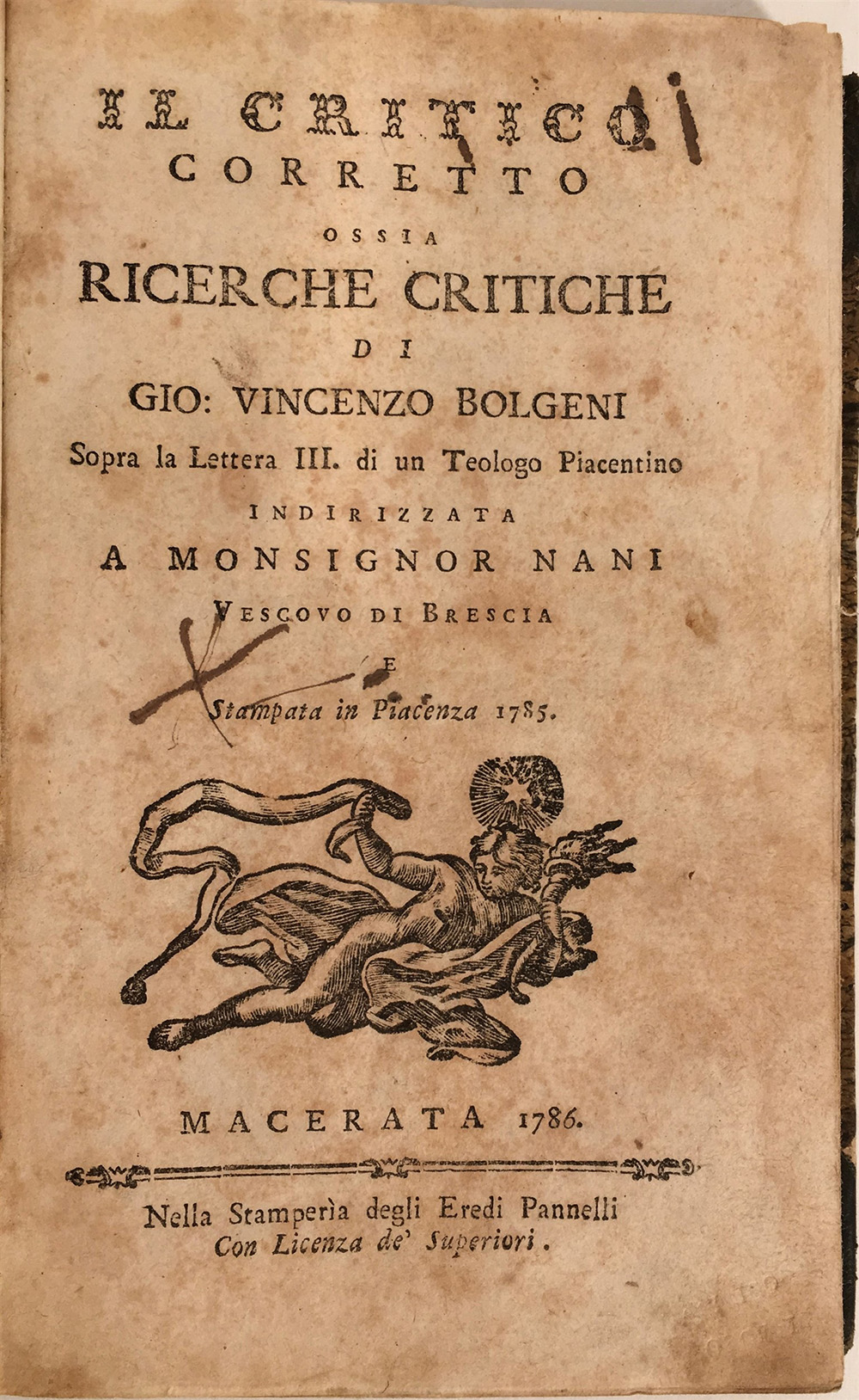 BOLGENI, Vincenzo - Il critico corretto. Macerata: Eredi Pannelli, 1786. Vol. in 8vo (esemplare fortemente brunito e fiorito). Legatura in mezza pelle (tracce di usura).