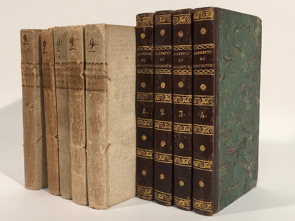 Lotto composto da 4 voll. di "Conte Filippo Re - Nuovi elementi di agricoltura. Milano: Silvestri, 1818", 5 voll. di "Corso di agricoltura. Firenze: Stamperia del Giglio, 1801". In 8vo, legature diverse (difetti).