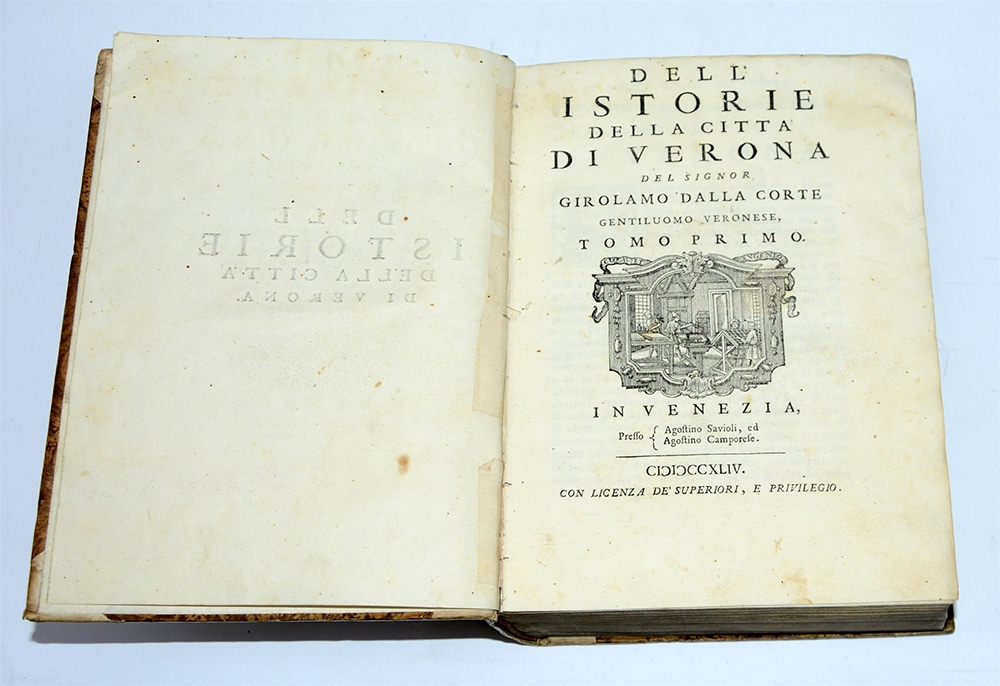Delle Istorie della città di Verona del signor Girolamo dalla Corte. Venezia: Agostino Savioli ed Agostino Camporese, 1744. Vol. in 4to. Legatura coeva in mezza pelle e piatti marmorizzati (lievi difetti).