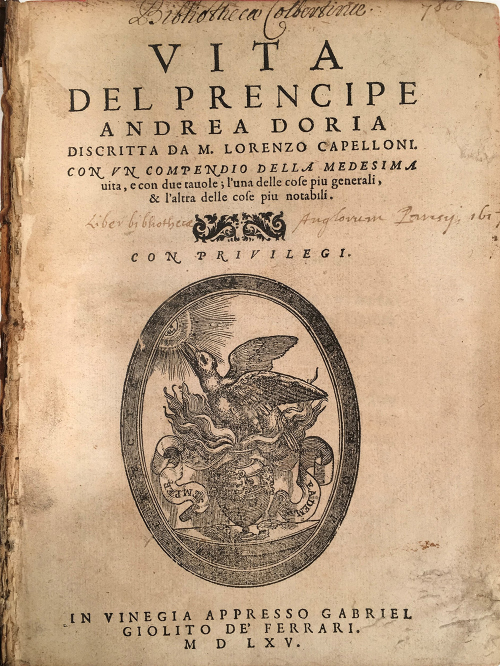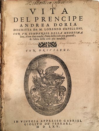 CAPELLONI, Lorenzo (1510-1590?) - Vita del prencipe Andrea Doria. Venezia: Gabriel Giolito de' Ferrari, 1565. 4to (195 x 144mm). Marca tipografica al frontespizio, fregi e iniziali xilografiche istoriate (mancano i due ritratti di Andrea Doria). Provenienza: Liber Bibliothecae Anglorum (Parigi, 1617, nota di posssesso al frontespizio) - Jean-Baptiste Colbert (1619-1683, nota di possesso).