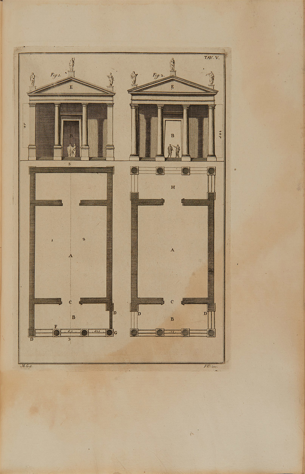 VITRUVIO POLLIONE, Marco (n. c. 80–70 A.C., m. c.15 A.C.). L’Architettura di M. Vitruvio Pollione colla traduzione italiana e comento del marchese Berardo Galiani. Napoli: Di Simone, 1758.